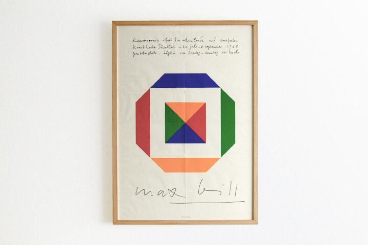 ドイツのデュッセルドルフ市立美術館にて1968年に開催されたMax Bill展のヴィンテージポスター。封筒サイズに折り畳みダイレクト・メールとして郵送された839×590mmのポスター。そのため折り目がついている点と、裏に宛先の住所・宛名が記載されているため若干透けて見えます点にご注意ください。