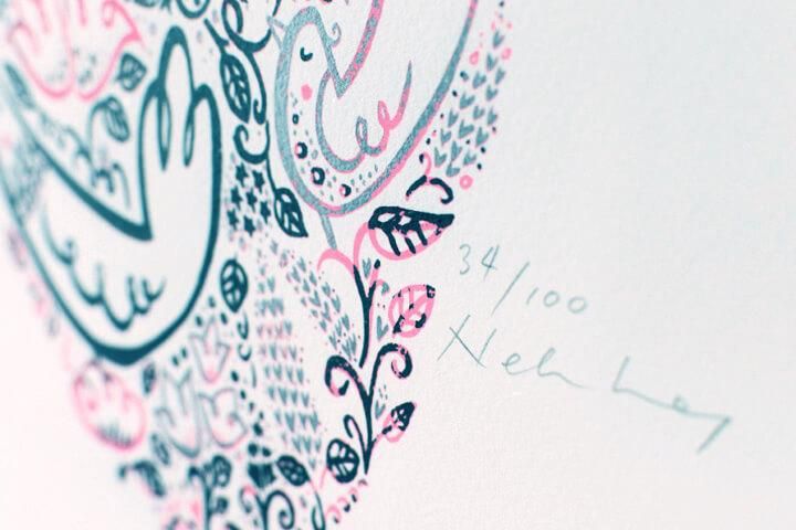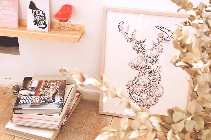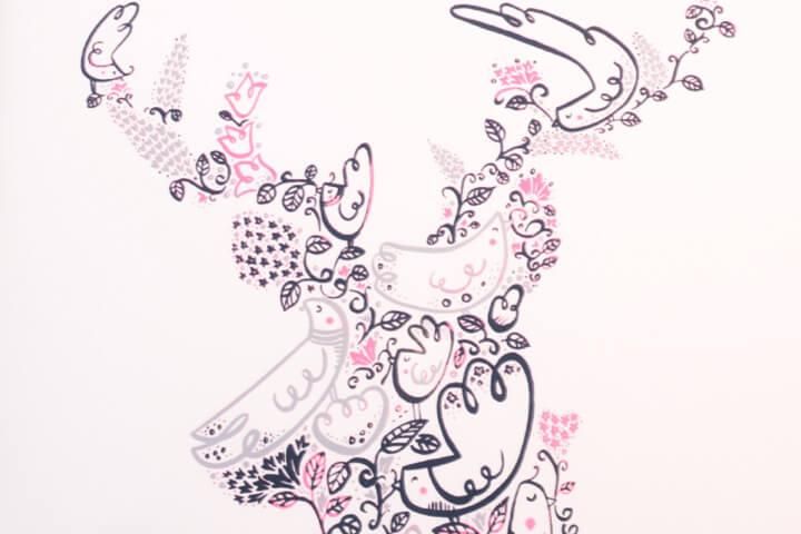 イラストレーターのヘレン・ラングによる作品。カラフルな草木花や鳥が絡み合う独特の装飾的なスタイル。彼女の好きな鹿の頭を独創的な世界観で表現しています。ピンク、シルバー、ブラックの調和は柔らかい空気を感じさせ、ゆっくりと深呼吸をさせてくれる、そんな一枚です。鹿に宿る森の息吹が感じられ、お子様から大人まで幅広く楽しんでいただけます。