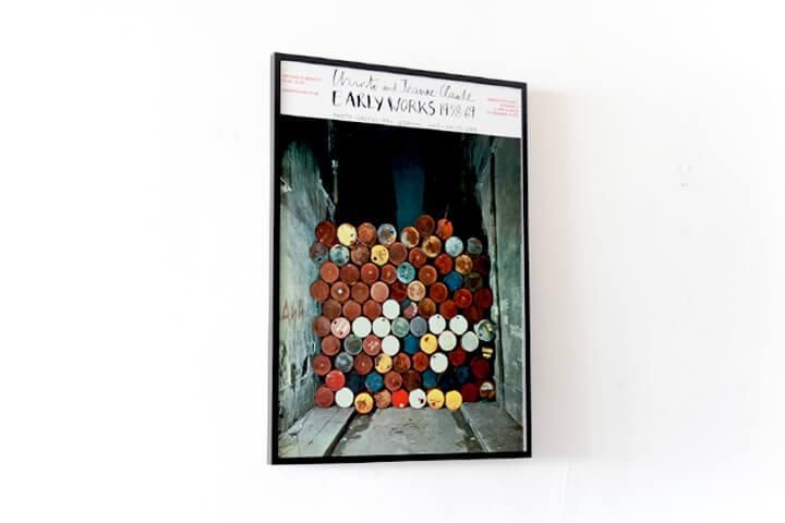 ドイツ・ベルリンのマーティン・グロピウス・バウ(ベルリン工芸博物館)で開催されたChristo & Jeanne-Claude夫妻の初期作品(1958年〜69年)の展示会ポスター。使用されている写真は1961年〜1962年のパリでの作品“Wall of Barrels - Iron Curtain - Rue Visconti, Paris,”です。カラーオフセットプリント。