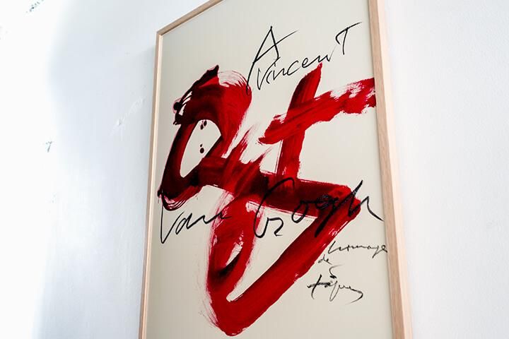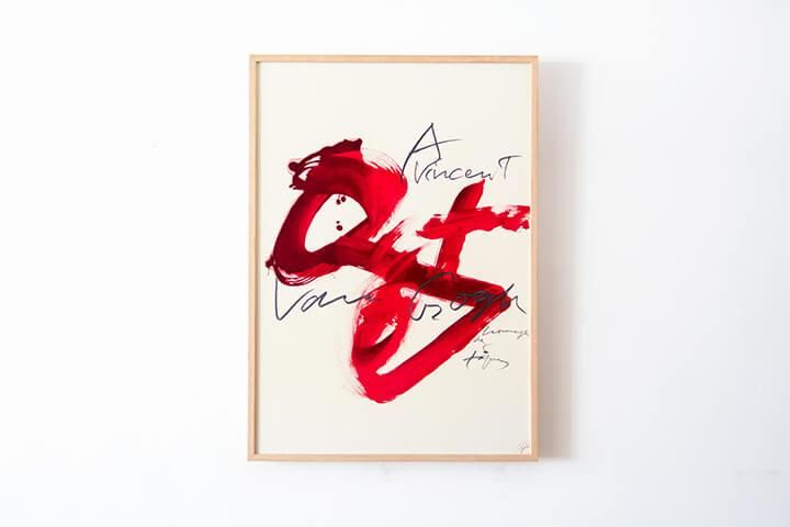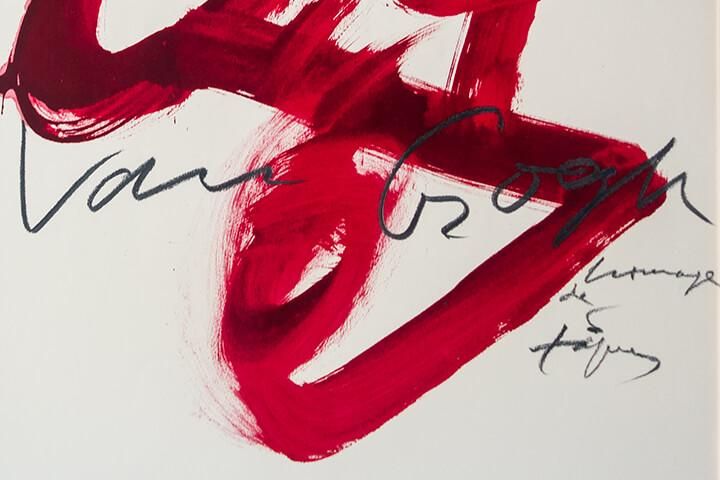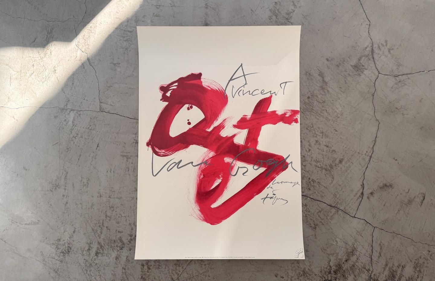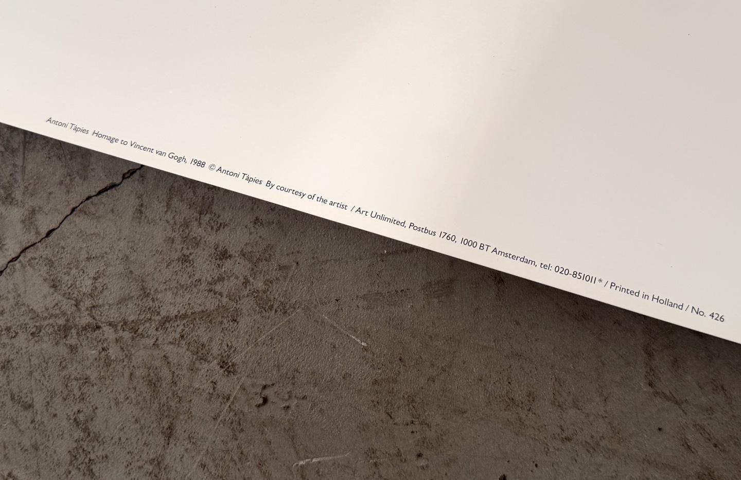 Antoni Tapies(アントニ・タピエス)デザインによる『Homage to Vincent van Gogh』の1988年版ポスター。「Stichting Vincent van Gogh 1890–1990」=ゴッホ財団が1990年に没後100年を記念して設立したプロジェクトでゴッホ没後100年記念事業の公式ポスターとして作成されました。ポスター下部には作品の詳細が記載されています。