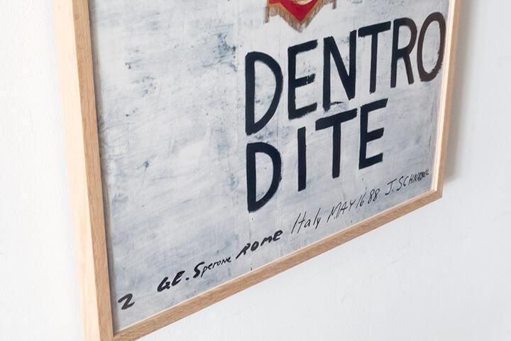 1988年にイタリア・ローマのガレリア スペローネで開催された『Dentro Dite』のエキシビジョンポスターです。ポスターデザインはJulian Schnabel(ジュリアン・シュナベール)によるものです。オフセットプリント。