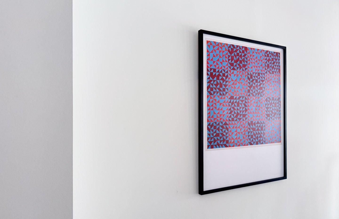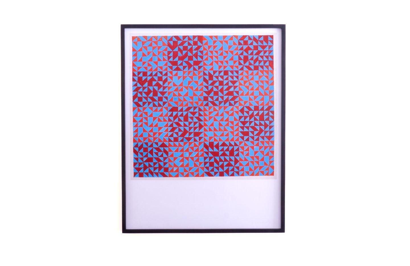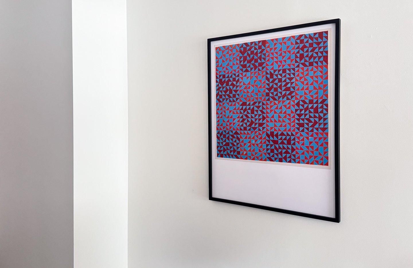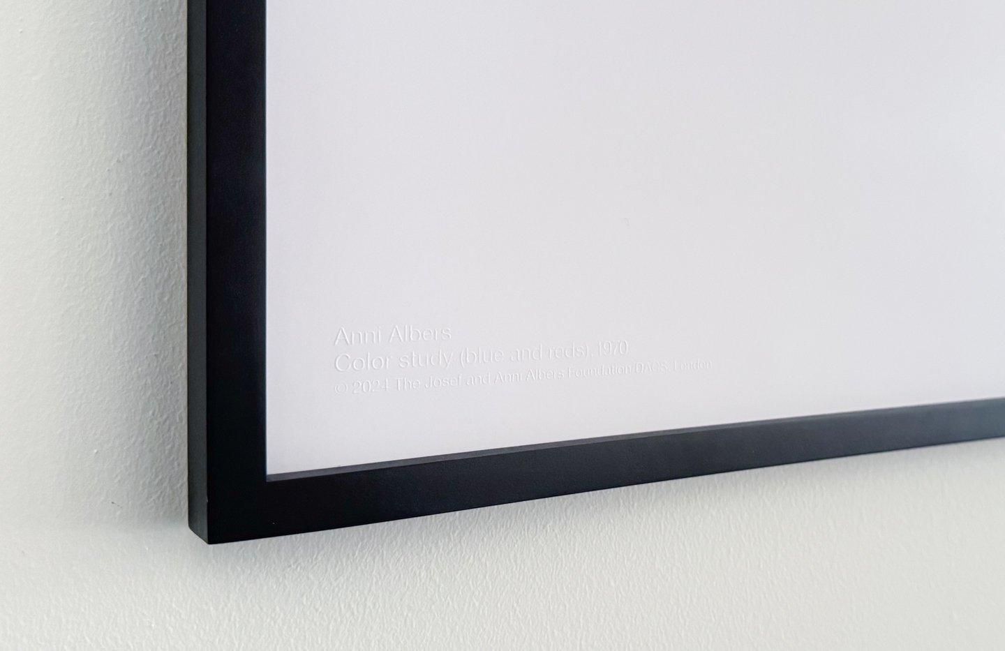 この1970年のColor Studyは、メキシコ・シティのカミノ・レアル・ホテルのために作成されたアンニ・アルバースの壁掛けのテキスタイル"COLOR STUDY (BLUE AND REDS)"です。彼女の三角形のモチーフの探求は、自然界の結晶構造における秩序と混沌の間の緊張との関わり、またメキシコ文化への関心を反映しています。メキシコを何度も訪れ、メソアメリカの造形に魅了された彼女は、コロンブス以前の工芸品や織物も収集しています。