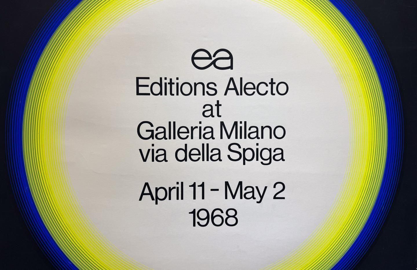 1968年にイギリスにおいて開催されたプリンター Editions Alecto のエキシビションのオリジナルヴィンテージポスターです。ご覧の通りコンディションについては掠れ、破け、シワが見らレます。味わいある一枚でシルクスクリーンプリントならではの深みがございます。
