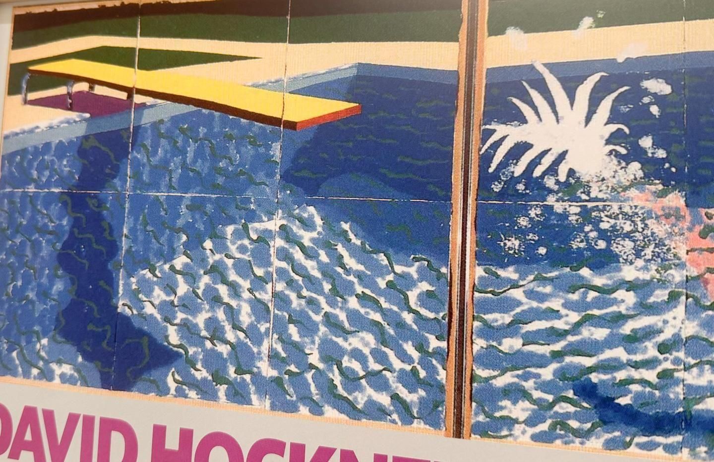 ポスターのメインイメージは、ホックニーが得意とするプールをモチーフにした作品。水面の揺らぎ、ダイバーの身体の分割表現が特徴的です。