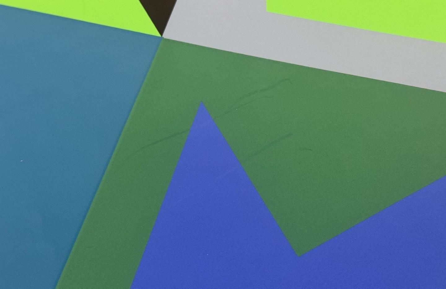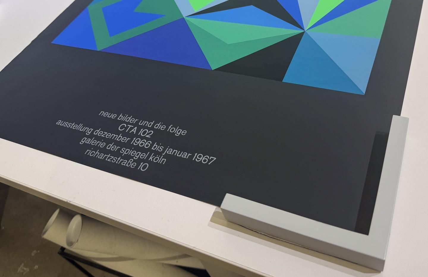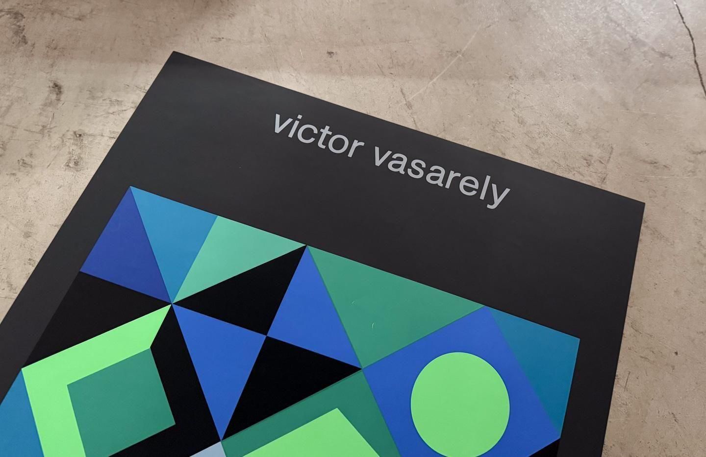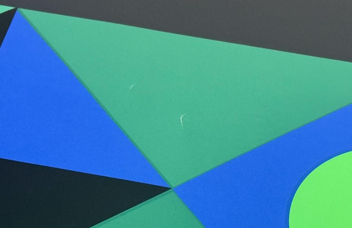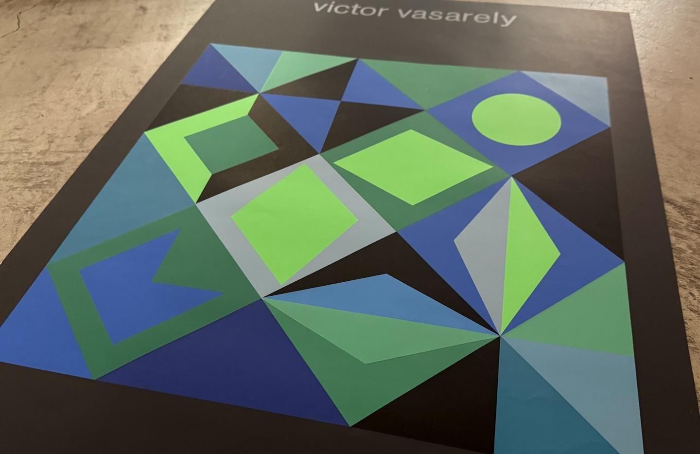 中央には、ヴァサレリの特徴である幾何学的な構成と鮮やかな色彩が配置され、青から緑へと滑らかに移ろうグラデーションが、作品特有の視覚的揺らぎを生み出しています。