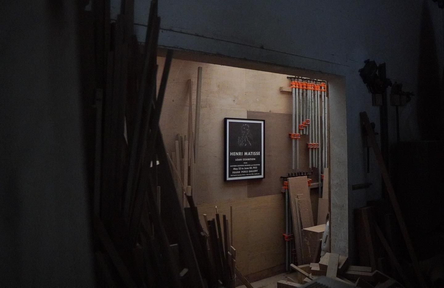 余白の静寂と、白線のわずかな震えが、死の直前まで続いた“Drawing with Scissors”期の精神性を静かに呼び覚まします。印刷は1950年代アメリカ西海岸らしい素朴で美しい活版の質感。時間の経過とともに深みを帯びた黒のトーンは、ヴィンテージポスターだけが持つ唯一無二の空気を纏っています。