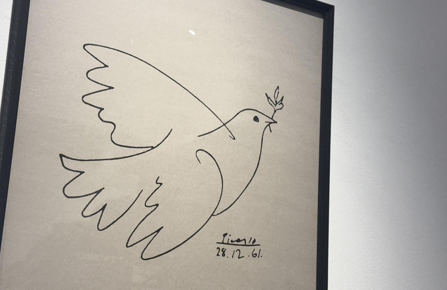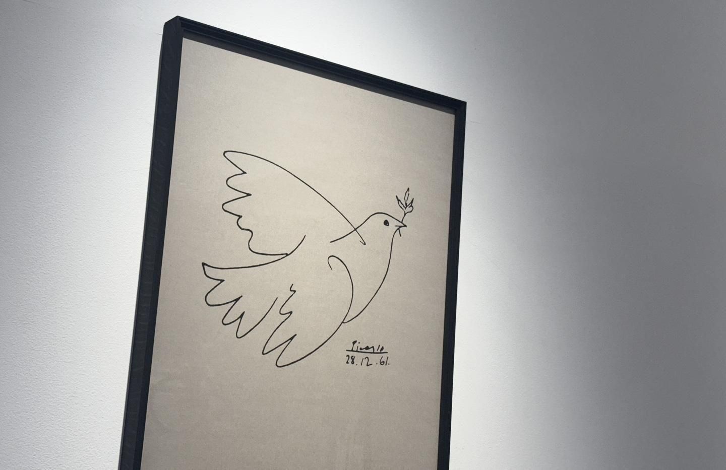 1961年のドローイングをもとにした一筆描きのハトは、ピカソ芸術の本質である「純度の高い線の美」を象徴し、静かに羽ばたくハトの姿は平和への願いと詩的な余韻を空間にもたらします。
